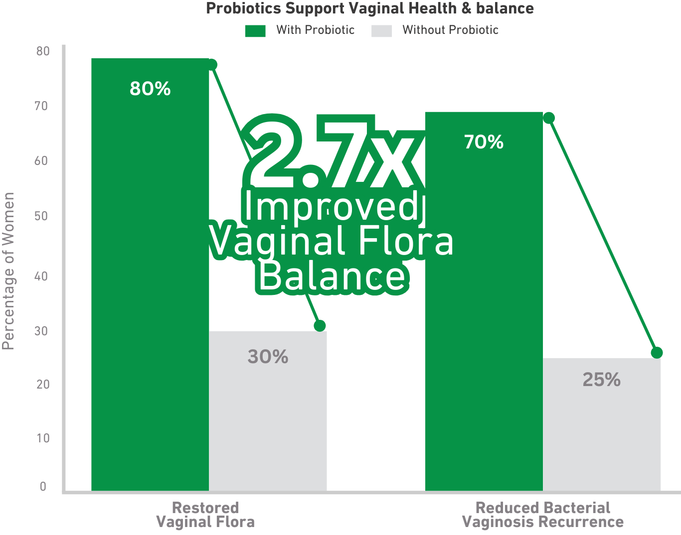 70 women participants consumed Women's Probiotic 50B CFU daily for 30 days. Percentages reflect the proportion of participants reporting the following benefits: