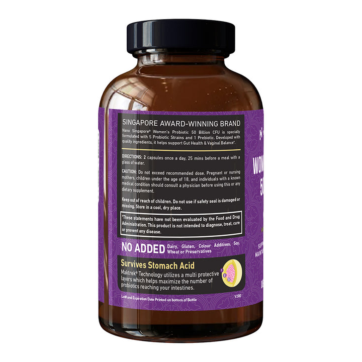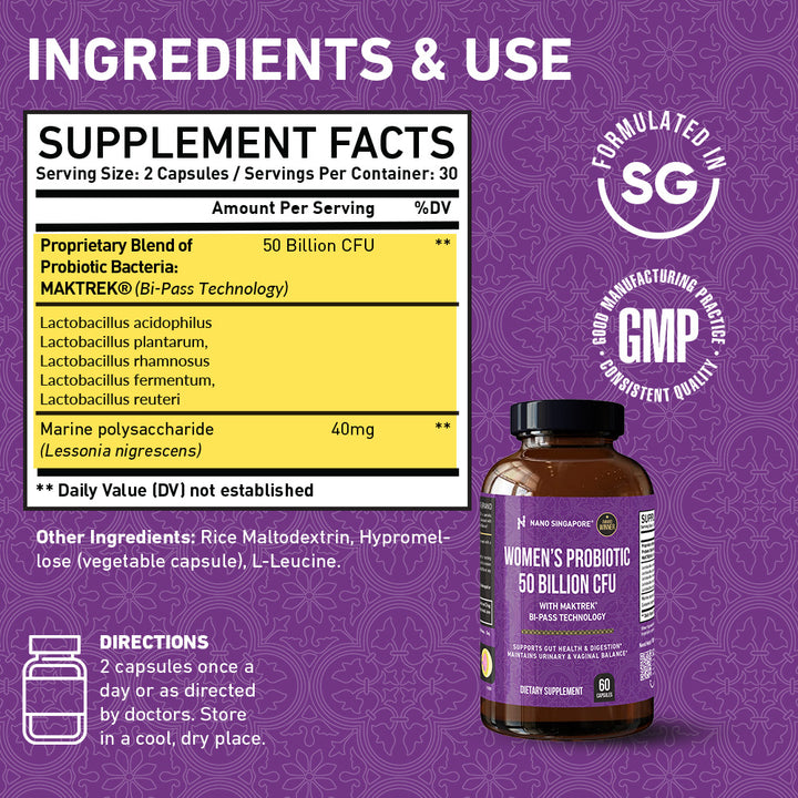 Nano Singapore Women’s Probiotic 50 Billion CFU is crafted for women seeking to support gut, feminine, and digestive wellness, while boosting probiotic survival for everyday balance and health.